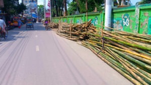 বরিশাল নগরীর সড়কে অবৈধ দখলে রমরমা বাঁশের ব্যবসা News News Desk প্রকাশিত: ১১:০১ পূর্বাহ্ণ, সেপ্টেম্বর ১৪, ২০২৫ স্টাফ রিপোর্টার: নগরীর মহাশ্বশান সংলগ্ন সড়কের জায়গা অবৈধ ভাবে দখল করে চলছে বাঁশের রমরমা ব্যবসা। মহাশ্বশান পাচিল ঘেঁষে সারি সারি বাঁশ রেখে প্রতিনিয়ত চলেছে এ ব্যবসা। ব্যস্ততম এই সড়কটিতে বিসিক শিল্প নগরীর বিভিন্ন পরিবহনসহ বিভিন্ন যানবাহন সেবা চলে আসছে দীর্ঘ বছর যাবৎ। তবে সরেজমিন দেখা যায়, অবৈধ ভাবে ব্যবসায়ীরা বাঁশ রেখে যানবাহন, সাধারণ পথচারী ও যাত্রীদের চলাচলে ব্যাঘাত ঘটাচ্ছে প্রতিনিয়ত। এসব সামগ্রী রাখার কারণে সড়ক সংকুচিত হয়ে পড়েছে। এমনকি বিভিন্ন সময় ঘটছে সড়ক দূর্ঘটনা। বরিশাল সিটি কর্পোরেশন কর্তৃপক্ষ জনসাধারনের সড়কে নিরাপদে চলাচলের স্বার্থে কোনো উদ্যোগ নিচ্ছে না বলে অভিযোগ পথচারিদের। মোটরসাইকেল চালক আরিফুর রহমান বলেন, ‘অনেক দিন ধরেই মহাশ্বশানের সড়কের পাশে এমন বাঁশ বিক্রির ব্যবসা চলছে । এতে সাধারণ পথচারীদের দুর্ভোগ বাড়ছে। দুই দিন আগে তো বড় ট্রাক থেকে বাঁশ নামানোর সময় পূরো সড়ক প্রায় আটকে ফেলেছিলো তখন বিপরীত দিক থেকে আসা একটি বাইক চালককে সাইড দিতে গিয়ে ব্যটারি চালিত রিকশায় থাকা এক শিশু দুর্ঘটনার শিকার হয়েছে । ওই সময় ছিটকপড়ে মাথায় মারাত্মক ব্যথা পেয়েছে শিশুটি। পথচরি মোঃ সুজন জানান, এখানে দীর্ঘদিন ধরে বাঁশ ব্যবসা চলছে। এতে করে ওই রাস্তা ব্যবহারকারী যানবাহন ও পথচারীরা চরম ভোগান্তিতে পড়ে। এ কারণে প্রায়ই ঘটছে ছোটখাটো দুর্ঘটনা। এ সব ব্যবসায়ীদের বিরুদ্ধে কোনো ব্যবস্থা নিতে দেখা যায় না প্রশাসনের। স্থানীয়দের দাবি, বাঁশ বিক্রির জন্য আলাদা স্থান রয়েছে। সেখানে বাঁশ বিক্রি করা যায়। কিন্ত তারা সেখানে রেখে বাঁশ বিক্রি না করে সড়কের পাশে পাচিল ঘেষে বাঁশ রাখছে যা বেআইনি। এমন ভাবে চললে প্রাণ হানির আশংকা আছে বলে মনে করেন এলাকার সচেতন মহল। দুর্ঘটনা রোধে সংশ্লিষ্ট কর্তৃপক্ষের হস্তক্ষেপ কামনা করেছেন এলাকাবাসী। এ সম্পর্কে নাম প্রকাশে অনিচ্ছুক বাঁশ ব্যবসায়ী বলেন, আমরা গরীব মানুষ। এটা বিক্রি করেই সংসার চালাই। আমাদের এখান থেকে বাঁশ বরিশালের বিভিন্ন স্থানসহ আশেপাশের জেলা গুলোতে যায়। বেড়া ও মাঞ্চা তৈারি করা হয় এ বাঁশ দিয়ে। অনেকে আবার বিল্ডিং এর কাজে নেন। মুসলিম কবর স্থানে ও আন্জুমান কবর স্থানেও আমাদের এখন থেকে বাঁশ যায়। এবিষয় বিসিসি কর্মকর্তার সাথে যোগাযোগ করবার চেষ্টা করলেও তা সম্ভব হয়নি। উল্লেখ্য, মহাশ্বশান সংলগ্ন লাকুটিয়া সড়ক খাল ২০২৫ সালের ৮ আগস্ট অবৈধ এ বাঁশের ব্যবসায়ীদের বিরুদ্ধে উচ্ছেদ অভিযান পরিচালনা করেন বরিশাল বিভাগীয় কমিশনার ও বিসিসি প্রশাসক রায়হান কাওসার। কিন্তু খাল ছেড়ে আসলেও এবার