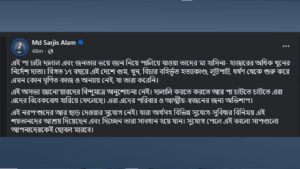 সারজিস লিখেছেন, এই পা-চাটা দালাল এবং জনতার ভয়ে জান নিয়ে পালিয়ে যাওয়া তাদের মা হাসিনা- হাজারের অধিক খুনের নির্দেশ দাতা। বিগত ১৭ বছরে এই দেশে গুম, খুন, বিচার বহির্ভূত হত্যাকাণ্ড, লুটপাট, ধর্ষণ থেকে শুরু করে এমন কোনো ঘৃণিত কাজ ও অন্যায় নেই, যা তারা করেনি।